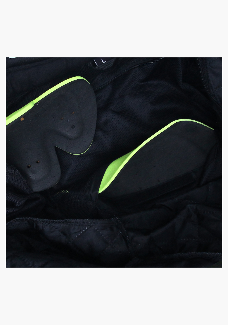 The jacket comes equipped with removable low profile C.E. approved shoulder and elbow protectors as well as a dual density spine pad.