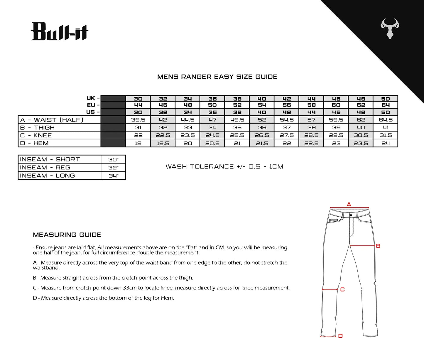 Available sizes 30-50 (Short/Reg/Long)