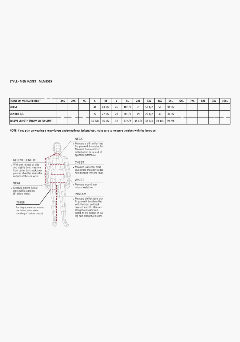 | 5XL | 31" | 56" | 29" | 27" | 23.5" | 30 | 29" | 6" |