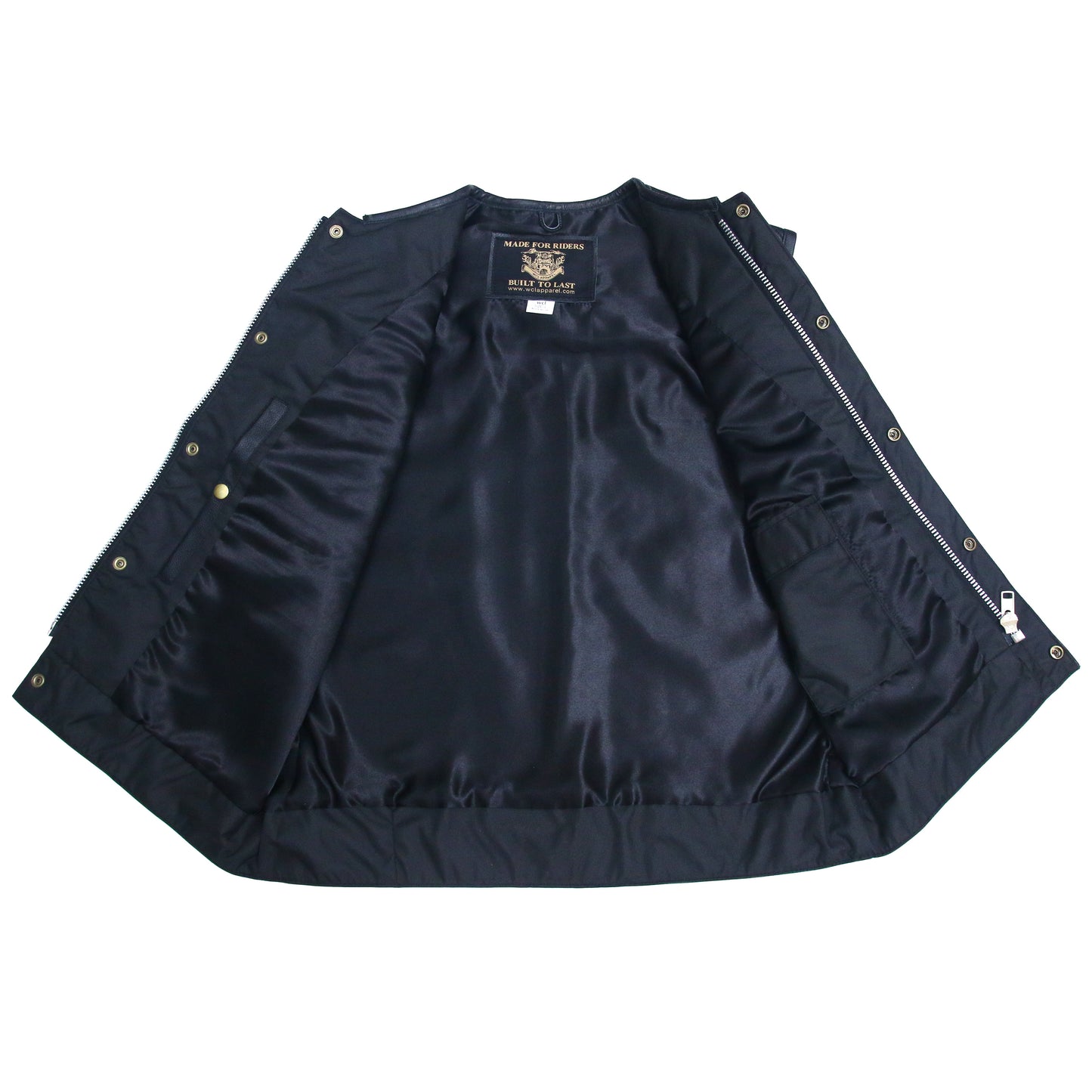 Features:Club style vest with one inch collar, covered snaps and hidden cropped center zipper.