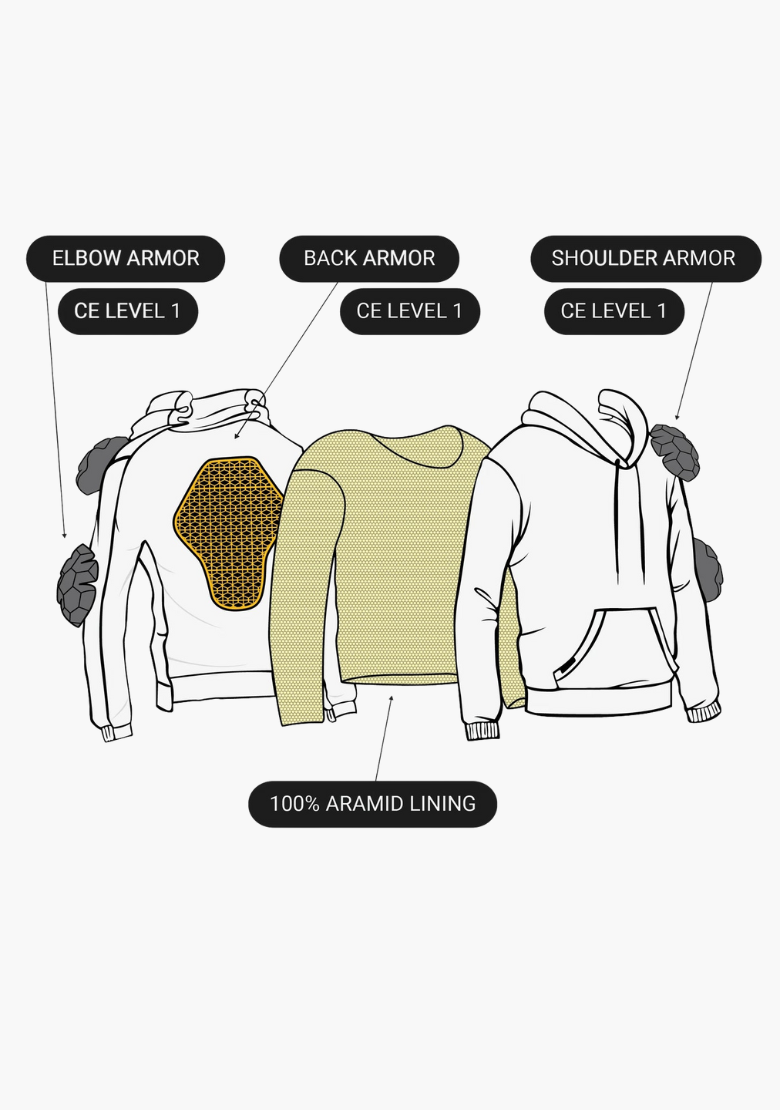 • Shoulders, elbows and back reinforced with aramid  kevlar Fiber and CE armor